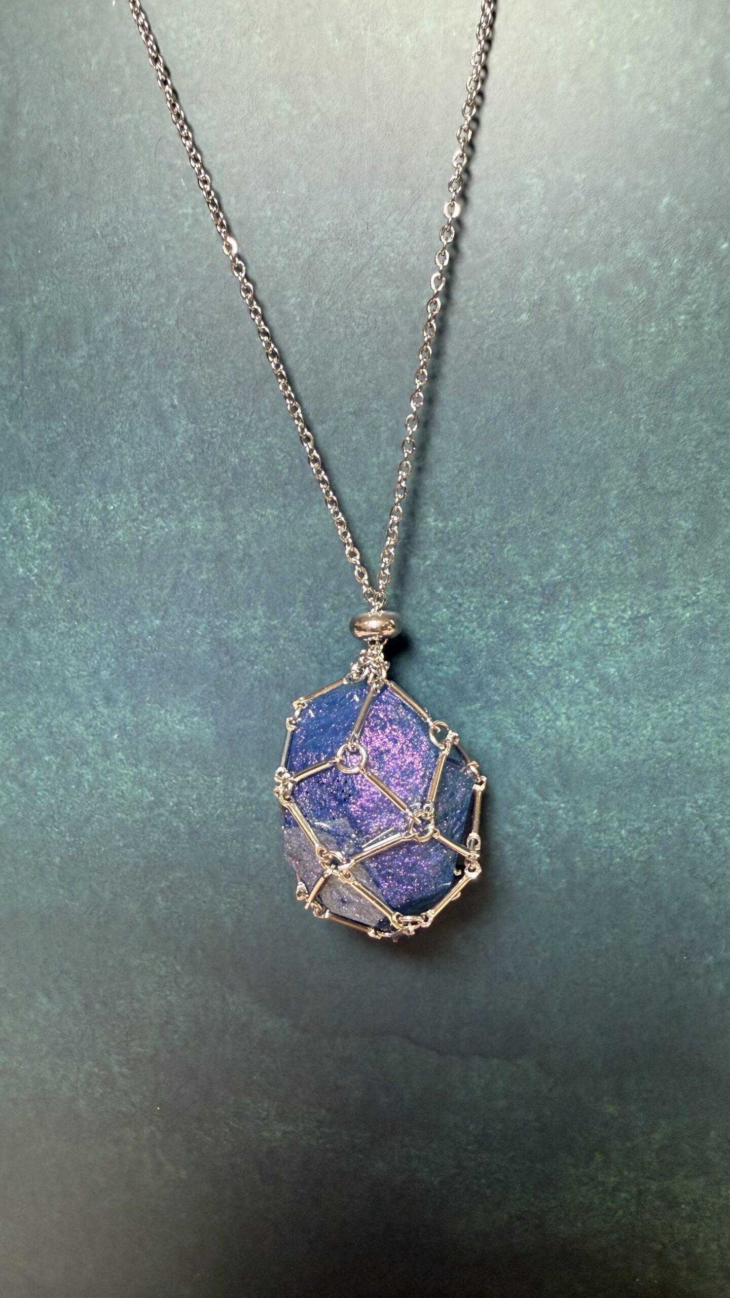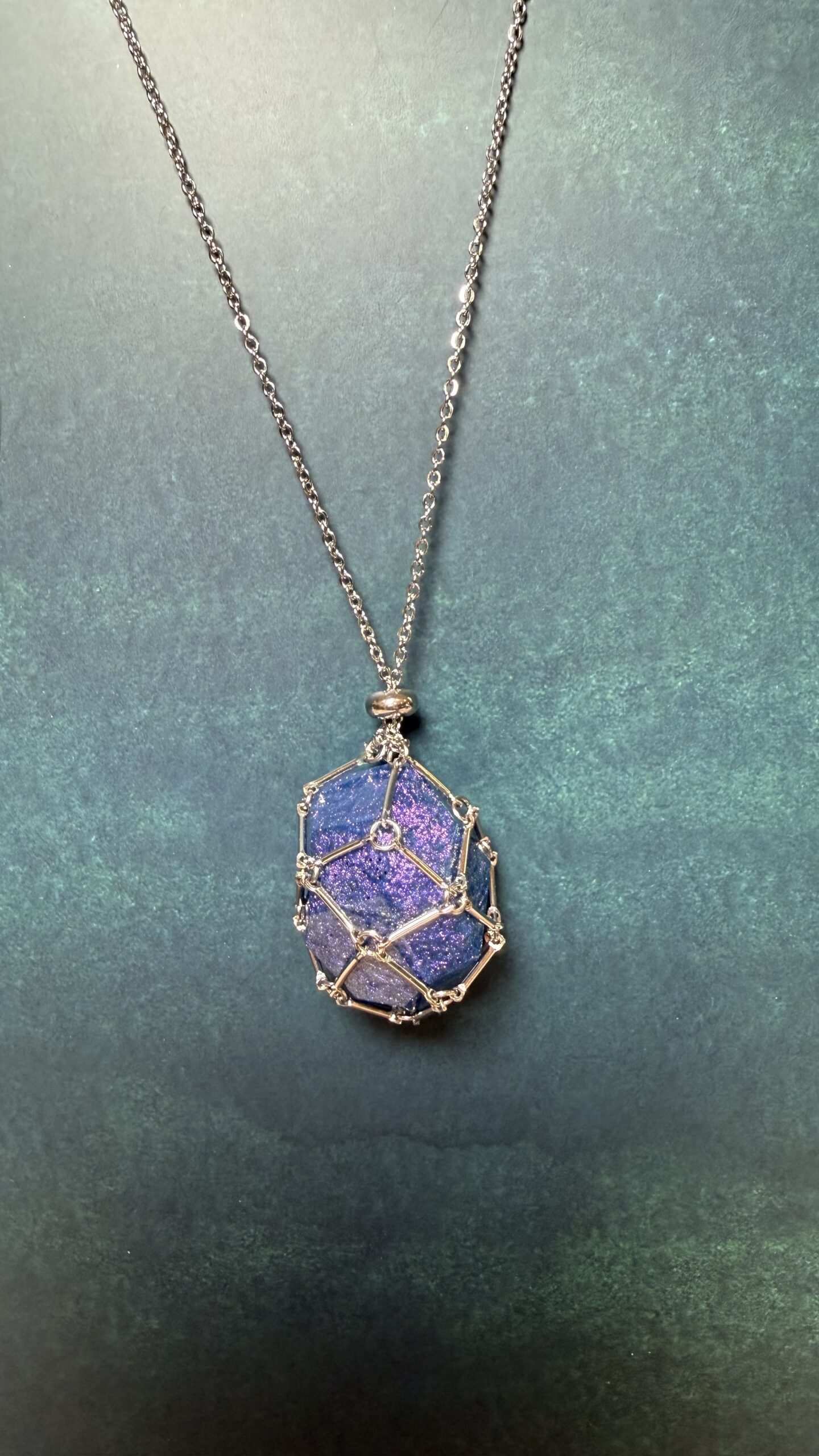 These beautiful cremation stone cage necklaces can be made out of any color you choose. This statement necklace features a large stone roughly an inch and a half long and about an inch wide.